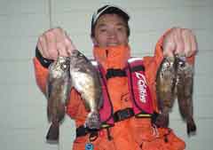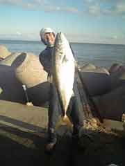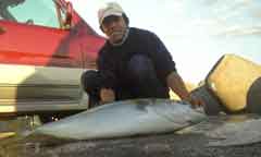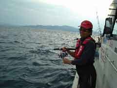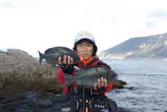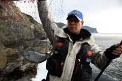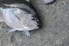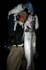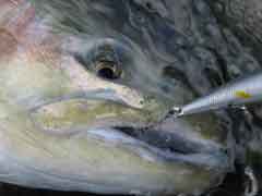 口元に光るフックはSBL−55M(#10)。魚へのダメージ軽減と手返しの早さ、そして何より安全性を考慮してシングルフックのバーブレス化を図ったのだ。しかし全てのミノーがシングル化に適している訳ではない。バランスを崩して泳がなくなってしまうものが多いのも事実。しかしその点、愛用のブラストイットミノーは自重の変化の影響を受けることなく、瀬の逆引きでもしっかりと泳いでくれるからとても頼もしい。このコンビなら、70アップも夢ではないだろう。