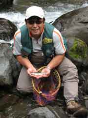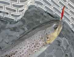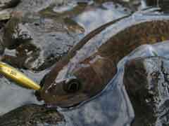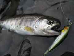 2008年終盤、管釣りシーズンの到来だ。この日は地元のルアー・フライスポット「しまごん」に出向く。あいにくの曇天で、開始早々にミノーでブラウンが出るも雨風ともに強くなって一時車へ退避。しばらくしてリリース専用ポンドも無人と化した。中断は10分程度。雨の弱まりを感じてポンドへ一番乗りし、新たにクイックスナップへセットしたのは竹ミノー2g(シルバー)だ。ロッドを水平チョイ上でスローリトリーブすると連続ヒットに突入。後にゴールド、赤金と繋いで6連続である。が、悲しいかな長くは続かないのが管釣りの常。ありとあらゆるルアーを登場させ、最後はスプーンの表層引きが絶好調。あまりにヒットするものだから、竹ミノーも「イケる?」と連続ヒット時同様にリトリーブする。しかしこれが全くの無視。管釣りの不思議を改めて感じた釣行であった。 |