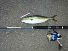 前回の釣行では友人に74cmのカンパチを釣られ悔しい思いでいっぱいでした。今回は私にも幸運のカンパチヒットとなるかと北井しましたが、ハマチでした。そらそうですよね・・・カンパチが簡単に釣れれば値打ちありませんよね(悔しい・泣き・・・)アマチ君ありがとう感謝してます。ジギングでも使用したジグはショアジギで使用する撃投ジグでフックはSJ-41TGです。使い慣れたジグが一番!! |