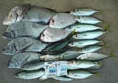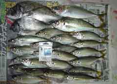 | 2週間ほど前に香川・栗島で思わぬ大アジが釣れたから20日、仲間と出掛けた。この日の天気は前回と打って変って晴天無風。しかし、潮も同様に正反対でサッパリ動かない。その為、狙いの大アジの回遊はなかったが、「遠投ハヤテ」8〜9号を使用してチヌ、コダイ、アジ、サバ、マイワシと五目釣りを楽しみました。 |
