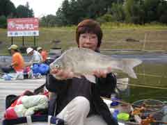 朝は3℃と冷え込みましたが、日中は秋晴れのよいお天気の中、立ち上がらないと取り込めないほど大型のヘラブナがたくさん釣れました。家内が持っているのは47.5cmの超大型です。