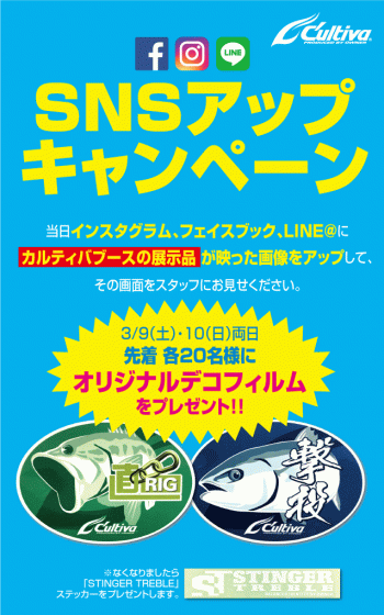 当日インスタグラム、フェイスブック、LINE@にカルティバブースの展示品が映った画像をアップしてくださった方は、その画面をスタッフにお見せください。オリジナルデコフィルム(両日各種先着20名様)をプレゼントいたします。無くなり次第、STINGER TREBLEのステッカーをプレゼントいたします。