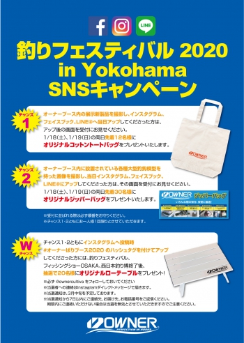 ②オーナーブース内に設置されている各種大型釣鈎模型を持った画像を撮影し、当日インスタグラム、フェイスブック、LINE@にアップしてくださった方は、その画面を受付にお見せください。1/18(土)、1/19(日)の両日先着30名様にオリジナルジッパーバッグをプレゼント!