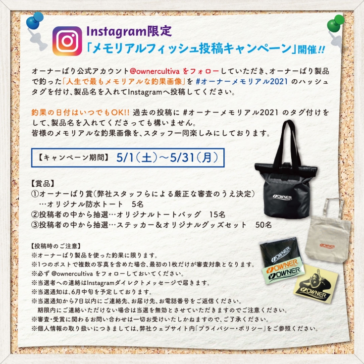 オーナーばりでは、下記概要でInstagram限定の「メモリアルフィッシュ投稿キャンペーン」を開催いたします。