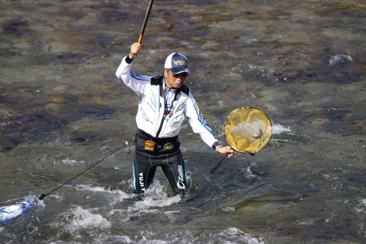 69歳とは思えない軽いフットワークでエリア内を縦横無尽に動き、次々にアユを引き出した辻行雄選手