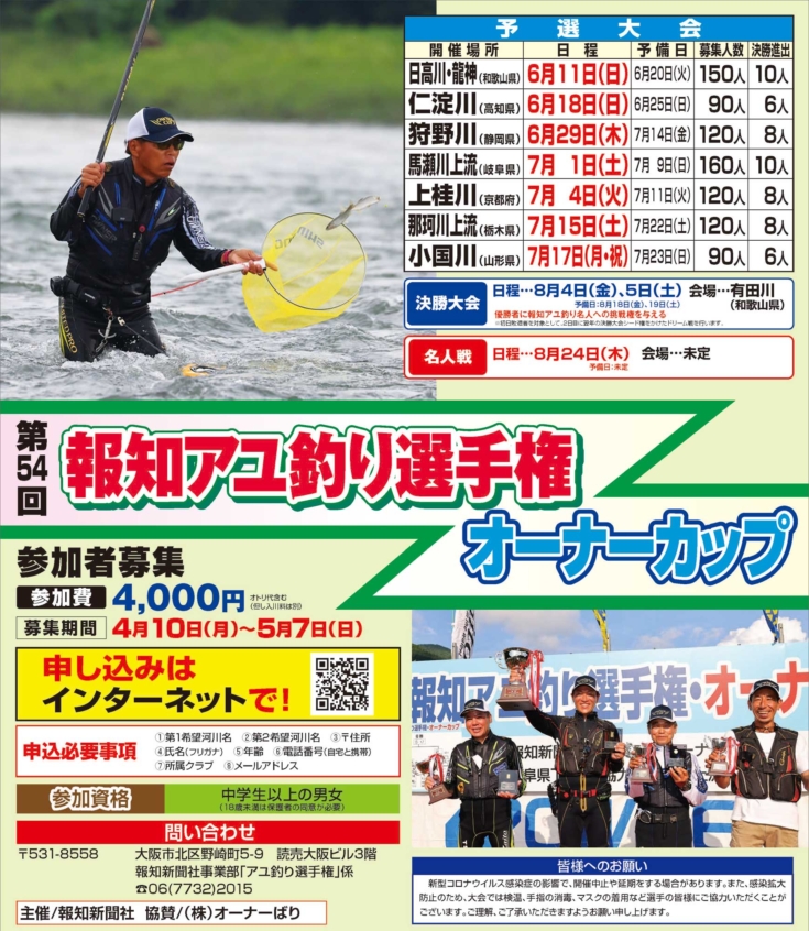 | 問い合わせ | 〒531-8558 大阪市北区野崎町5-9 読売大阪ビル3階 報知新聞社事業部「アユ釣り選手権」事務局 TEL:06-7732-2015(受付時間 10:00~18:00 土日祝を除く) |