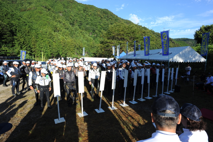 渇水&高水温と厳しいコンディションで迎えた決勝大会。少しでも状況のいい場所を求めて、抽選番号の若い選手からオトリを受け取りポイントへ急ぐ