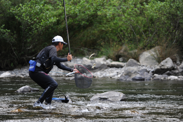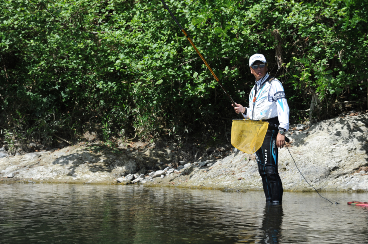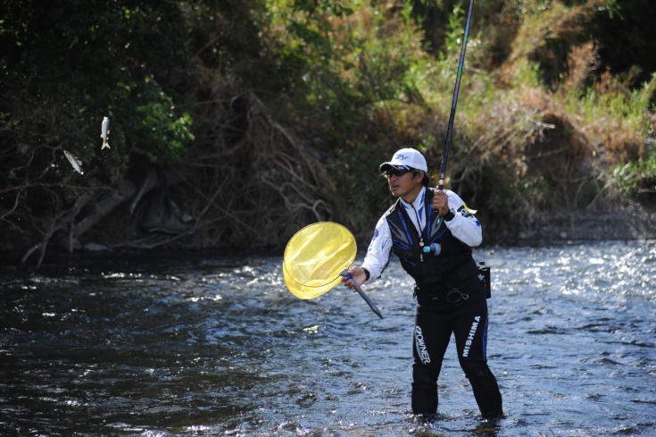巧みにオトリを泳がせて掛けていく松本一平選手