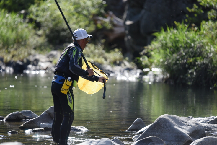 一方の内山選手は白波や泡立ち、流れのヨレなどここぞというポイントを狙っていきますが、オトリが替わらず苦戦。そのまま前半を折り返します。