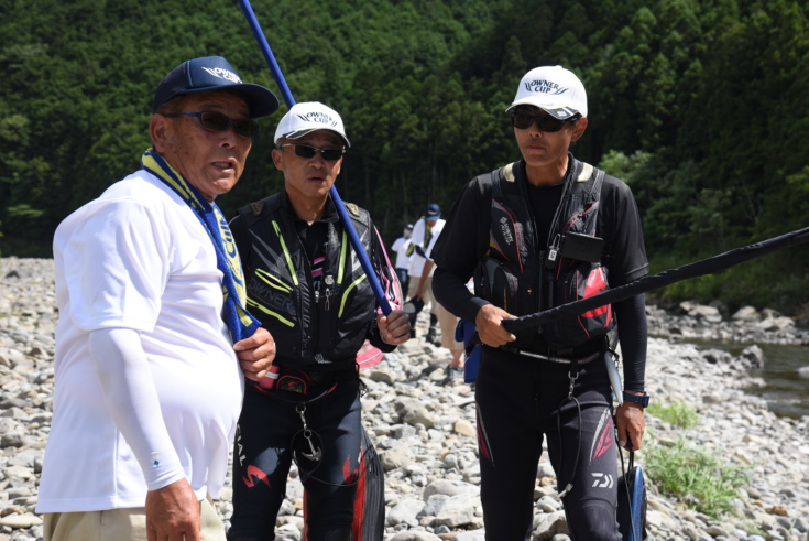 7年ぶりとなる有田川での決勝大会ですが、連日の猛暑による渇水と高水温で、初日の朝の水温はすでに27度。野アユの追いは悪く、オトリもすぐに弱ってしまう厳しい釣りが予想されました。