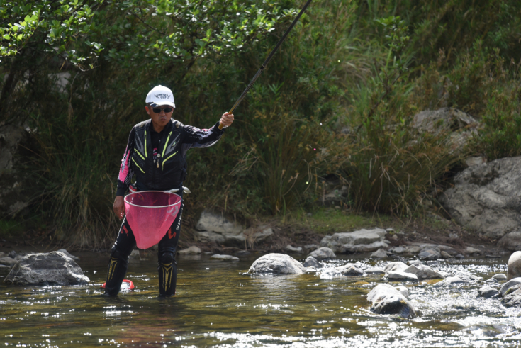 開始直後は境界線近くを攻めていた坂本選手ですが、5分ほどで上流左岸の岩盤へ大きく移動。狙いが的中し41分に1匹目を掛けますが、残念ながらバレてしまいます。しかし、49分にオトリを替えると55分に2匹目を追加。境界線近くまで釣り下った3時22分に3匹目をキャッチしました。