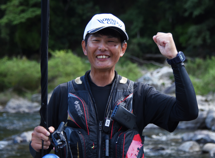 後半は競技エリアの最下流部に入った坂本選手が、開始早々に4匹目を仕留めます。その後、境界線近くまで一気に戻り波立つ石の頭など元気なオトリだからこそ入るポイントを狙って、4時21分と28分に掛けて込み8尾。オーナーカップの栄冠を奪取しました。