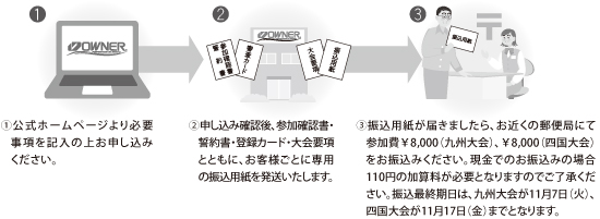 ①大会エントリーフォームから必要事項を入力の上お申し込みください。