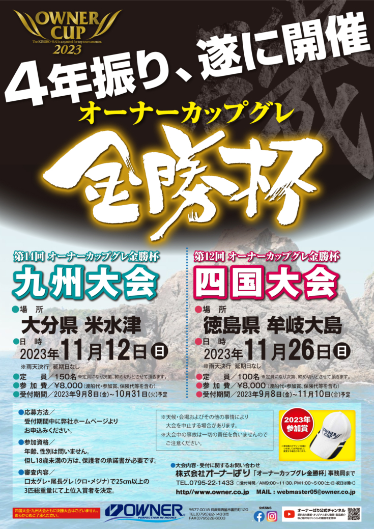 | 大会についてのご連絡先 | 〒677-0018 兵庫県西脇市富田町120 (株)オーナーばり「オーナーカップグレ金勝杯」係まで TEL:0795-22-1433 FAX:0795-22-6003 |