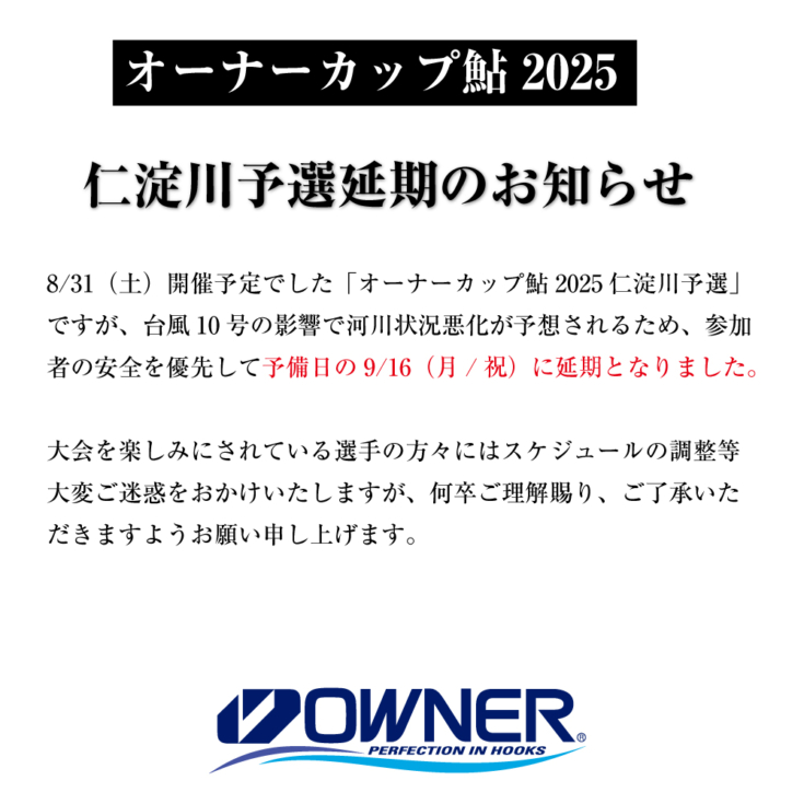 8月31日(土)開催予定でした「オーナーカップ鮎2025仁淀川予選」ですが、台風10号の影響で河川状況悪化が予想されるため、参加者の安全を優先して予備日の9月16日(月/祝)に延期となりました。 大会を楽しみにされている選手の方々にはスケジュールの調整等大変ご迷惑をおかけいたしますが、何卒ご理解賜り、ご了承いただきますようお願い申し上げます。