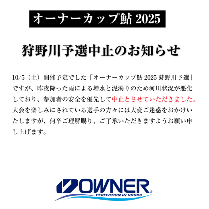 10/5(土)開催予定でした「オーナーカップ鮎2025狩野川予選」ですが、昨夜降った雨による増水と泥濁りのため河川状況が悪化しており、参加者の安全を優先して中止とさせていただきました。 大会を楽しみにされている選手の方々には大変ご迷惑をおかけいたしますが、何卒ご理解賜り、ご了承いただきますようお願い申し上げます。
