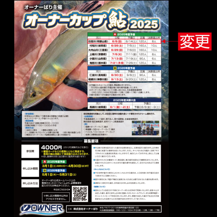 このたび、「オーナーカップ鮎2025」日高川龍神予選(和歌山県)につきまして、当初ご案内しておりました開催日 6月1日(日)/予備日6月8日(日) は、和歌山県知事選挙の実施に伴い会場が使用できなくなったため、下記の通り日程を変更させていただくこととなりました。
