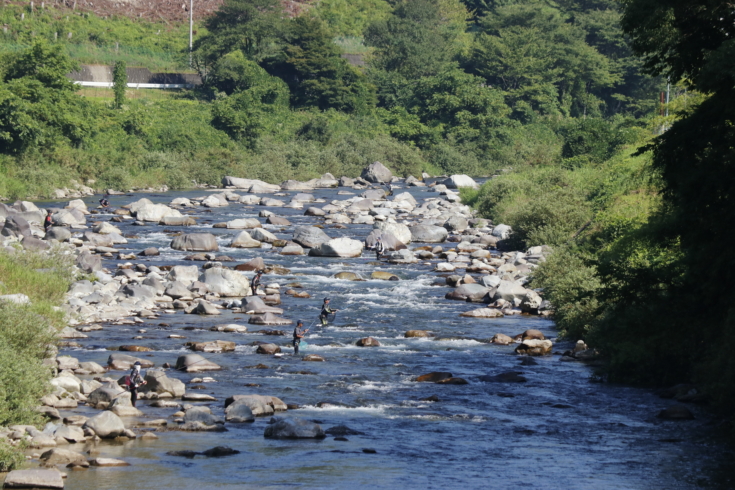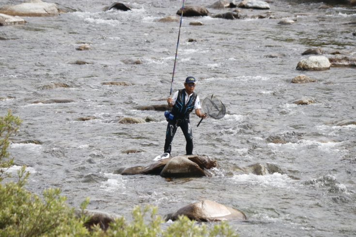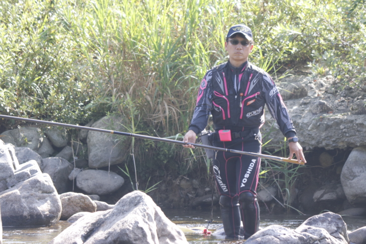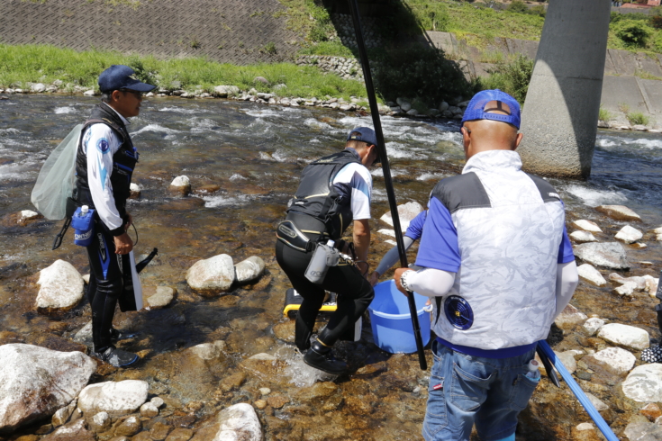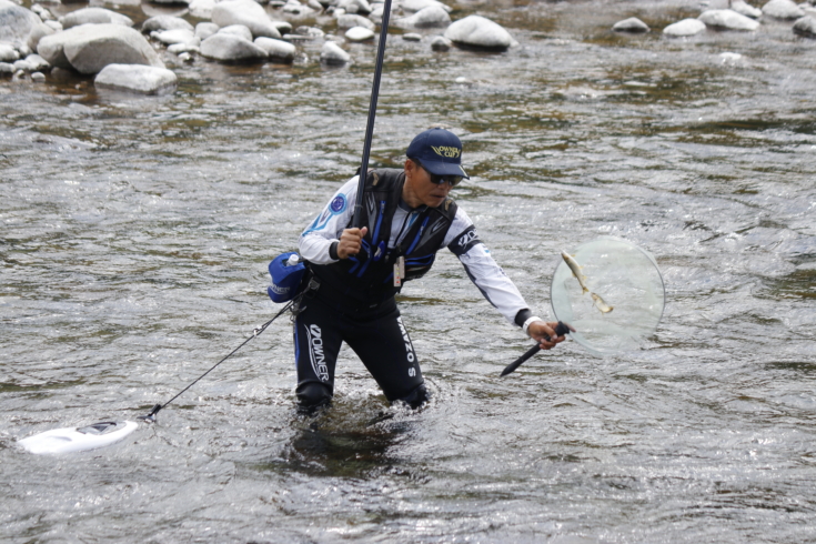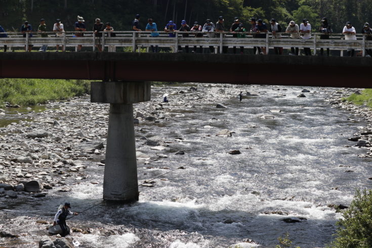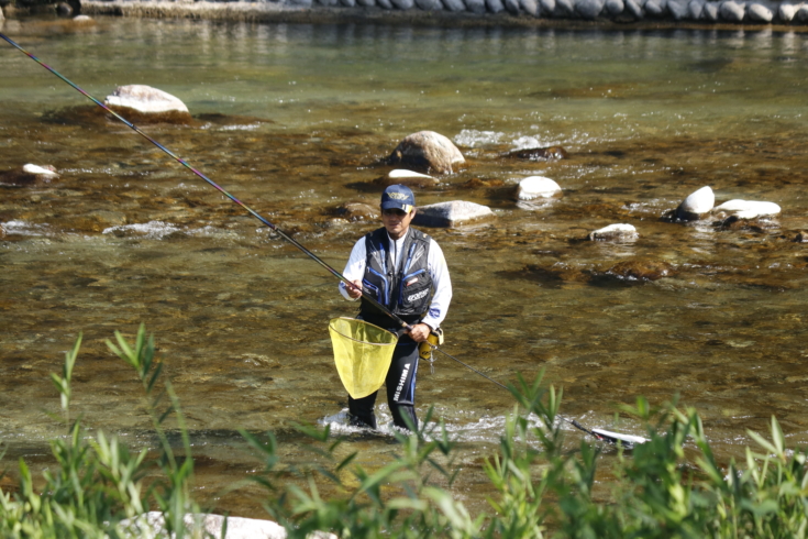 当日の馬瀬川は、先日の大雨の影響を引きずっており、追いが良いとは言えないような状況。連日の猛暑で平水より10cm減、場所によっては垢ぐされ傾向で、前日に下見をした選手からは、「厳しい」「数釣れない」「場所選びが難しい」などの声も。