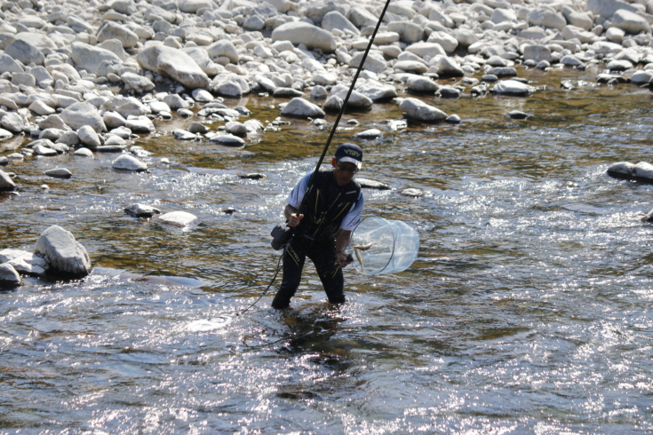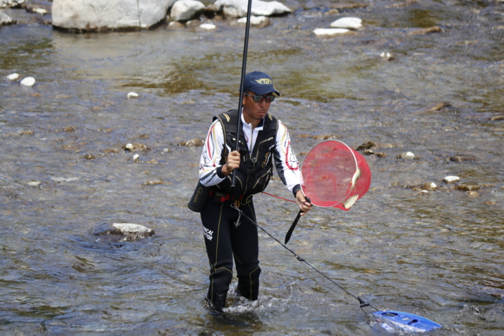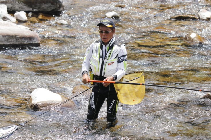 得意のメルファブレイドTG2を使った釣りでコンスタントに鮎を引き出す上田弘幸選手