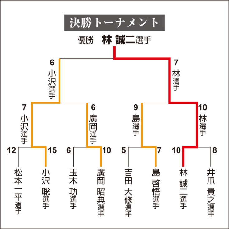 準々決勝は松本一平選手対小沢聡選手、玉木功選手対廣岡昭典選手、吉田大修選手対島啓悟選手、林誠二選手対井爪貴之選手の戦いとなりました。