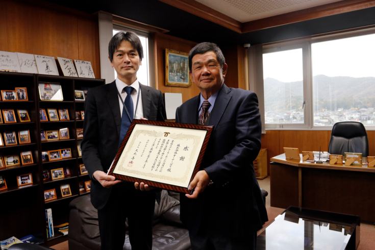 このたび、その寄附に対し、本日、当社本社にて神戸市環境局部長岡田篤様より、弊社代表取締役社長 中道成之へ感謝状が授与されました。