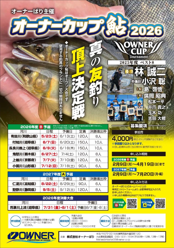 ・オーナーカップ鮎では、公平な運営を図るため、年間(決勝戦を境に更新)を通じてご参加いただける予選は「お一人につき1会場のみ」としております。そのため、2025年に実施いたしましたオーナーカップ鮎2026 仁淀川予選ならびに相模川予選にお申し込みいただいた方は、今年度の予選(2026年B予選)へのエントリーはできません。なお、申し込み後にキャンセルされて出場されなかった場合も、同様の扱いとなりますのでご留意ください。