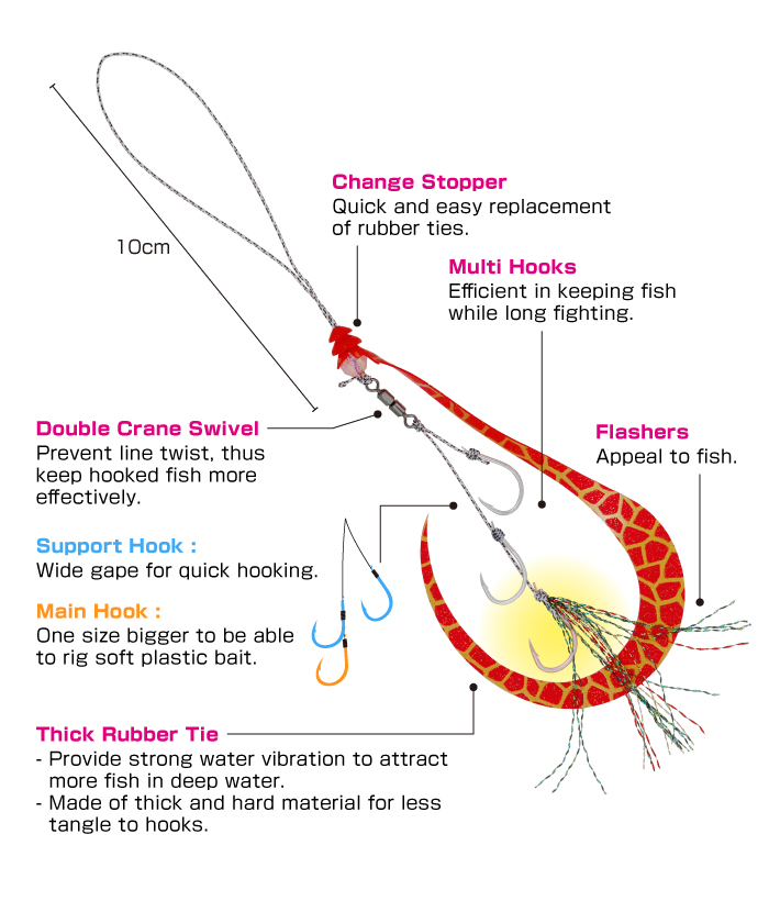 【What is “AMA-RUBBER”?】 “AMA”=AMADAI(Tilefish) “RUBBER”=Rubber skirt, Soft bait “AMA-RUBBER” is tilefish fishing using “TAI-RUBBER” rig. “TAI-RUBBER” is a traditional method of snapper fishing. Very easy and simple technique for anyone which you need to just repeat; fall the rig and retrieve slowly when it hits the bottom. The rig consists of colorful lead with rubber ties and skirts, it is imitating small fish, squid or seaweed. |