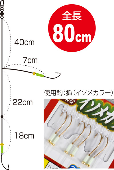 ●吸い込みのよい狐鈎。 ●のまれ切れを防ぐ中軸鈎&太ハリス |