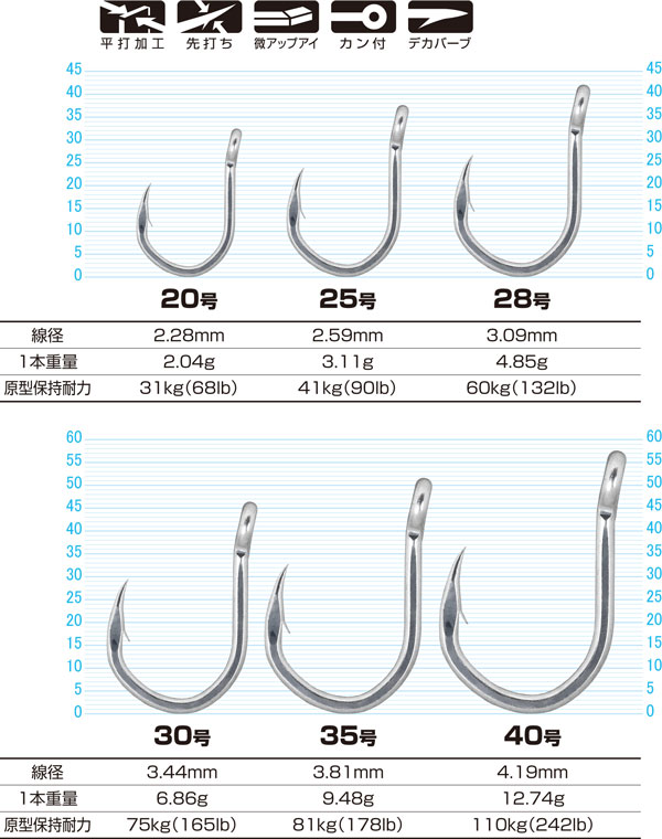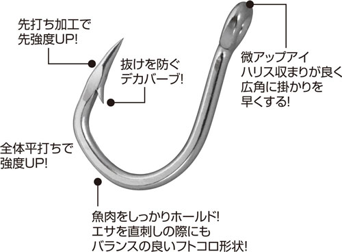 【大物対応ハリ先】敢えてテーパーを短くすることで、硬い大物の口周りに負けない強靭なハリ先 ●大物泳がせ釣り |