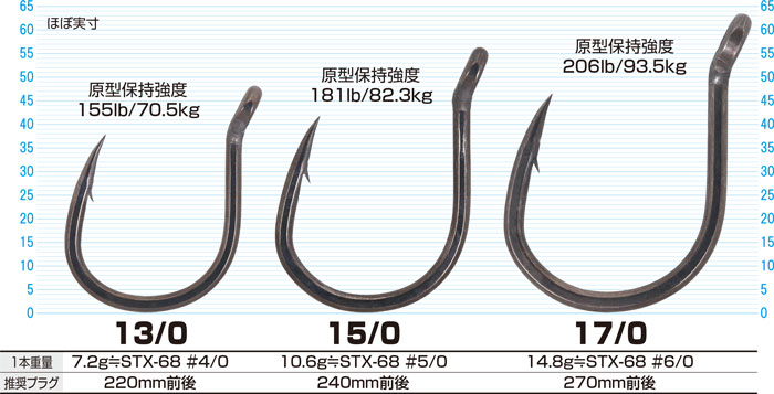 | No.12363 | 13/0 | 7.2g | 155lb/70.5kg | 220mm前後 | ¥900 | 4953873316333 |