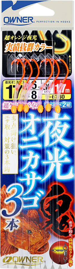 オレンジ発光が安定のアピール力 ●深場での実績抜群のオレンジ夜光鈎【夜光オニカサゴ】使用 オニカサゴ専用鈎でバレに強く、またヒネリが無いためエサが回らず仕掛がヨレない!! 3本鈎×2組入り |