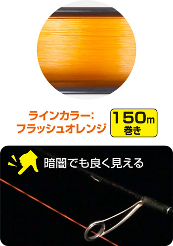 常夜灯下・暗闇でラインが強調され視認性抜群「フラッシュオレンジ」 ● 150mの十分な糸巻量 |