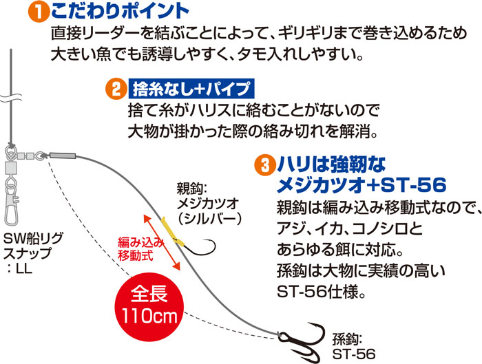 ①こだわりポイント ②捨糸なし+パイプ ③ハリは強靭なメジカツオ+ST-56 |