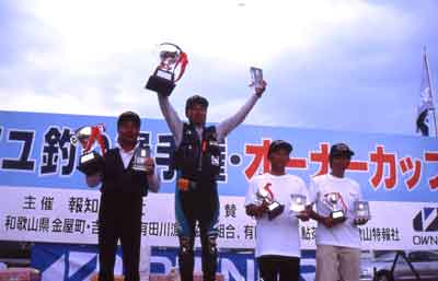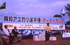 今大会では、ベテラン選手を押さえ若手選手が奮闘した大会であった。そして、着々と世代交代が始まって来ているように感じた。表彰式では、(株)オーナーばり中道社長から、オーナーカップを受け取り、満面の笑顔でウイニングポーズを取った小池選手が実に印象的だった。こうして無事第36回報知アユ釣り選手権オーナーカップは、幕を下ろした。