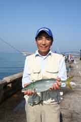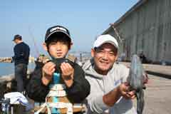 釣果のほうは、紀州釣りでチヌ・グレが、遠投カゴ天秤仕掛では、ハマチやサワラなどの青物が竿をひぱり、岸壁際を探れば20cm弱のカワハギやガシラの姿が、サビキ釣りでは、25cmを越えるアジが数釣れ、波止の上は色んな魚で賑わった。