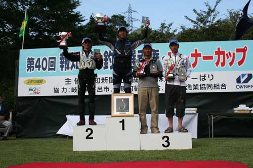 表彰式では、(株)オーナーばり中道成之社長より金プレートと鈎額がそれぞれの入賞者に手渡され、無事「第40回報知鮎釣り選手権オーナーカップ」が閉幕した。 |