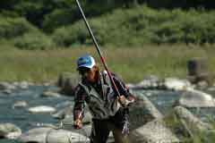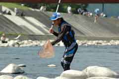 後半になると、永島寛選手が深めの流芯を攻め、立て続けに3匹釣り上げ、徐々に上田弘幸選手を引き離していった。その後も、橋下の流れが速い筋などを攻め釣果を上げた。