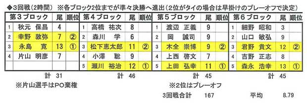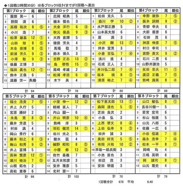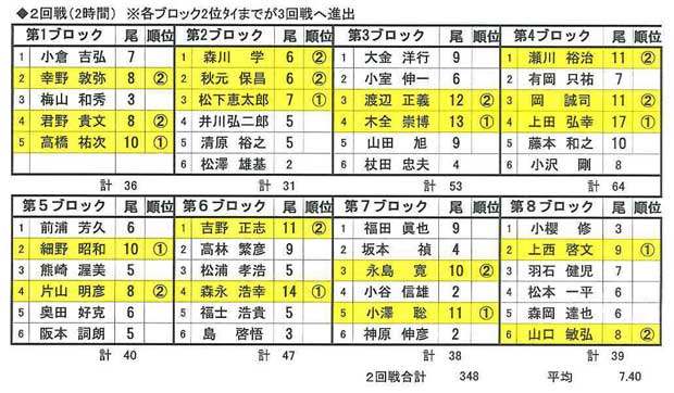 結果、第25回大会に優勝された永島寛選手、昨年度ベスト8の木全崇博選手、過去2回優勝経験のある瀬川祐治選手らがベスト8へ勝ち上がり、一日目が終了した。