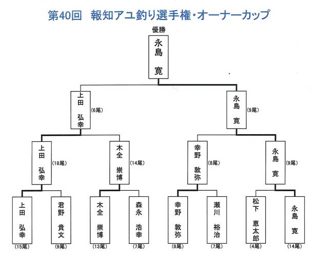 上田弘幸選手も終了間際に、1匹釣り上げ追いつこうとするが、結果9対6で永島寛選手が勝利し、15年ぶり2度目の優勝をとげた。優勝された永島寛選手は、昨年乾敏志選手が優勝され名人位を獲得されたことに刺激をうけ、今年は何回も下見や実釣を繰り返したことで、今大会で優勝でき、とてもうれしいとの事だった。