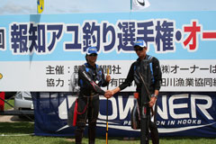 これに負けじと沓澤選手も、後半戦上流部の平瀬狙いで釣果を伸ばし、巻き返しをはかるが、前半の勢いを持続し続けた廣岡選手に一歩及ばず、結果、36対24で廣岡昭典選手が「第42回報知アユ釣り選手権・オーナーカップ」のタイトルを獲得した。 |