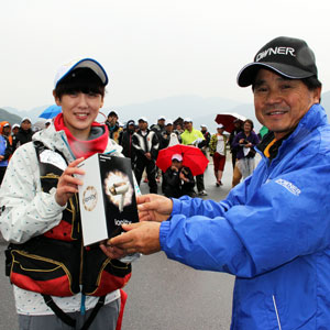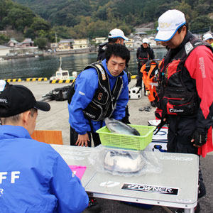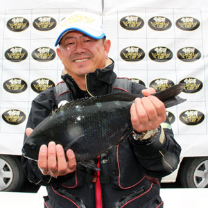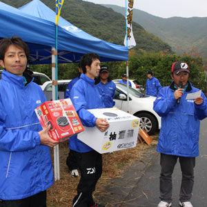 「マサカリ」の磯へ上がった島根直人(シマネナオト)選手は、朝一はアテ潮によりキタマクラとキビナゴの大群に手を焼かされましたが、午前8時頃から次第に潮が沖向きに払い出し、それ以降グレの活性が高まり、競技終了の12時までに40cm前後のグレを3枚に、規定サイズの25cmオーバーを10枚以上釣り上げ、見事、金勝杯の栄冠を掴みとりました。