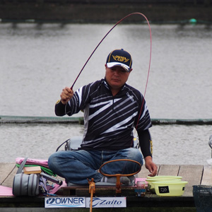 早朝から雨が振ったりやんだりのどんよりとした空模様で、全般的に深いタナ(チョーチン)は不調。元来、チョーチン釣りが得意な堀川要一選手(9尺チョーチンウドンセット)、黒沢清孝選手(9尺チョーチン両ダンゴ)、染谷永心選手(9尺チョーチン両ダンゴ)の3名以外は全員規定のメーターの釣りで、岡田 清選手、戸井田祐一選手、長野明正選手、染谷 剛選手、山内克己選手が両ダンゴ、石倉義久選手が得意のウドンセットで挑む。