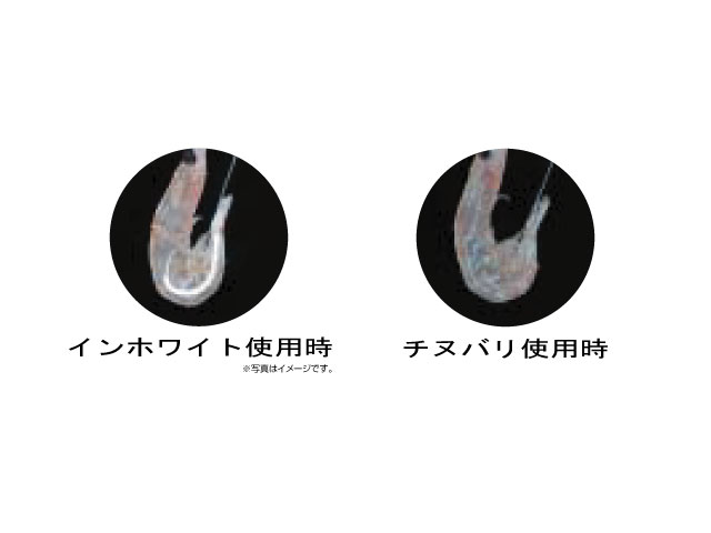 エサが際立つ”白”それが「インホワイト」 1.白っぽいマキエやムギと馴染む 2.エサが発色し、目立たせる 3.トップレスコートで瞬時に貫通 4.太ハリスのスッポ抜け、チモトのハリス切れを防ぐ”プラスエッジ”