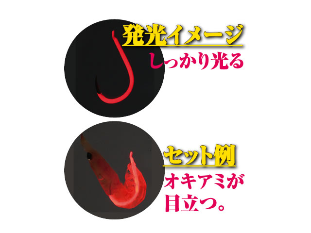 夜光ピンクがオキアミを刺した際でも違和感なくしっかりと目立たせる。