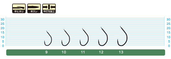 ●フトコロが広く大きなエサをつけやすく、ハリ先がしっかり露出し、サクラマス、遡上魚、大型ニジマスなどの豪快にくわえ込むアタリに対して確実にフッキングさせ、上アゴに鋭く刺さり込む。