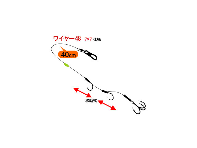 ワイヤー先端のトリプルフックで大型タチウオもガッチリ掛けます。また、ワイヤーリーダー上を移動する2本の鈎でエサの付け易さが抜群です。