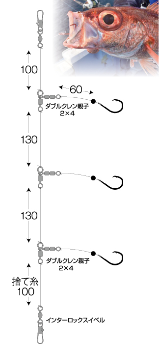 赤ムツ専用鈎を使用した胴突3本仕掛です。