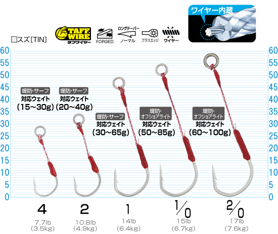 | 2/0 | ¥780 | ジガーライト早掛 | 17lb(7.6kg) | 対応ジグ目安:60~100g | 4953873254505 |