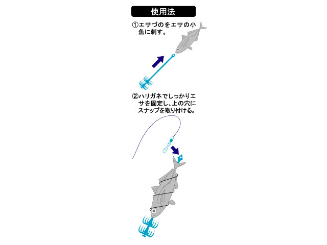 全長14cmのスティックエサづのタイプ。エサづのに小魚を刺して、付属のハリガネでしっかりと固定して上の穴にスナップを取りつけて下さい。かえし付鈎使用 2組入り