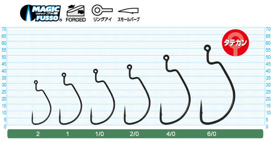 | MFコーティング | MF(MAGIC FUSSO)コーティングを採用し、形状とのバランスでワームずれは軽減しつつ魚への貫通性を高めました。 |